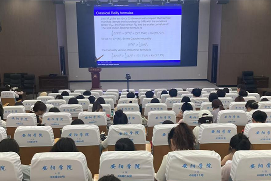 张佳丽主持讲座 讲座伊始,张佳丽老师向参加讲座人员介绍了本次讲座的背景意义与主讲人简介。张佳丽老师指出,Reilly型积分公式是几何分析中的重要工具,由著名数学家Robert Reilly提出,其核心在于揭示了流形上的曲率、体积与边界积分之间的深刻联系。 黄广月教授讲座中 讲座中,黄广月教授就“Reilly型积分公式及其相关应用”三方面展开讲解: 1. Reilly型积分公式:核心内容及其应用 讲座中,黄广月教授通过经典案例阐释了该公式如何将流形内部的几何量(如Ricci曲率、标量曲率)与边界上的几何量(如平均曲率、第二基本形式)关联起来,为研究流形的拓扑与几何性质提供了强有力的分析手段。 黄广月教授指出,Reilly型公式在等周不等式、特征值问题及刚性定理等领域具有广泛应用。例如,通过该公式可推导出球面作为极值流形的唯一性,或分析紧致流形上Laplace算子的谱性质。这一理论不仅深化了人们对几何结构的理解,还为物理中的广义相对论和材料科学中的界面问题提供了数学支撑。 2. 数学背景:曲率、体积与边界的统一框架 讲座第二部分聚焦Reilly型公式的数学背景。黄广月教授从微分几何的基本概念出发,详细讲解了公式的推导过程: 曲率与体积的关联:通过积分几何技巧,将流形内部的Ricci曲率与体积增长速率联系起来。 边界项的几何意义:边界积分项反映了流形“边缘”的弯曲程度,如平均曲率如何影响内部几何的全局行为。 教授特别强调,Reilly型公式可视为Gauss-Bonnet定理在高维流形上的推广,其价值在于将局部几何信息(曲率)与整体拓扑约束(如欧拉示性数)紧密结合。这一框架为研究奇异流形或非光滑空间的几何分析开辟了新途径。 3. 前沿进展:现代几何研究中的突破 在讲座最后,黄光月教授分享了Reilly型公式的最新研究动态: 最优传输与几何不等式:结合最优传输理论,研究者改进了Reilly型公式中的常数估计,推动了几何不等式的精确化。 Alexandrov空间与度量几何:该公式被推广至更一般的度量空间,为研究“非光滑”几何对象(如带锥奇点的流形)提供了新工具。 人工智能中的几何建模:Reilly型公式在计算机图形学和医学影像分析中的应用潜力逐渐显现,例如通过曲率流算法优化三维模型重建。 黄教授尤为强调微分几何与其他学科交叉融合的重要性。他通过实际案例展示了微分几何在计算机图形学、理论物理等领域的应用,极大地拓宽了师生们的学术视野,让大家深刻认识到微分几何在解决实际问题中的关键价值。报告现场,师生们全神贯注,沉浸在知识的海洋中,不时为黄教授的精彩讲解报以热烈掌声。 讲座互动环节现场 互动环节中,同学们积极踊跃,纷纷就微分几何学习与研究中遇到的困惑,如某些定理的应用场景、研究方法的选择等向黄教授请教。黄教授耐心倾听,凭借渊博的学识和独到的见解,为同学们一一答疑解惑,现场交流氛围热烈非凡。许多同学表示,通过与黄教授的交流,对未来的研究方向有了更清晰的规划,收获满满。 本次讲座不仅深化了师生们对Reilly型积分公式的理论认知,更展现了数学工具在交叉学科中的桥梁作用。我们期待这样的高水平讲座持续举办,为推动我校数学学科发展、培养创新型人才注入持久动力。