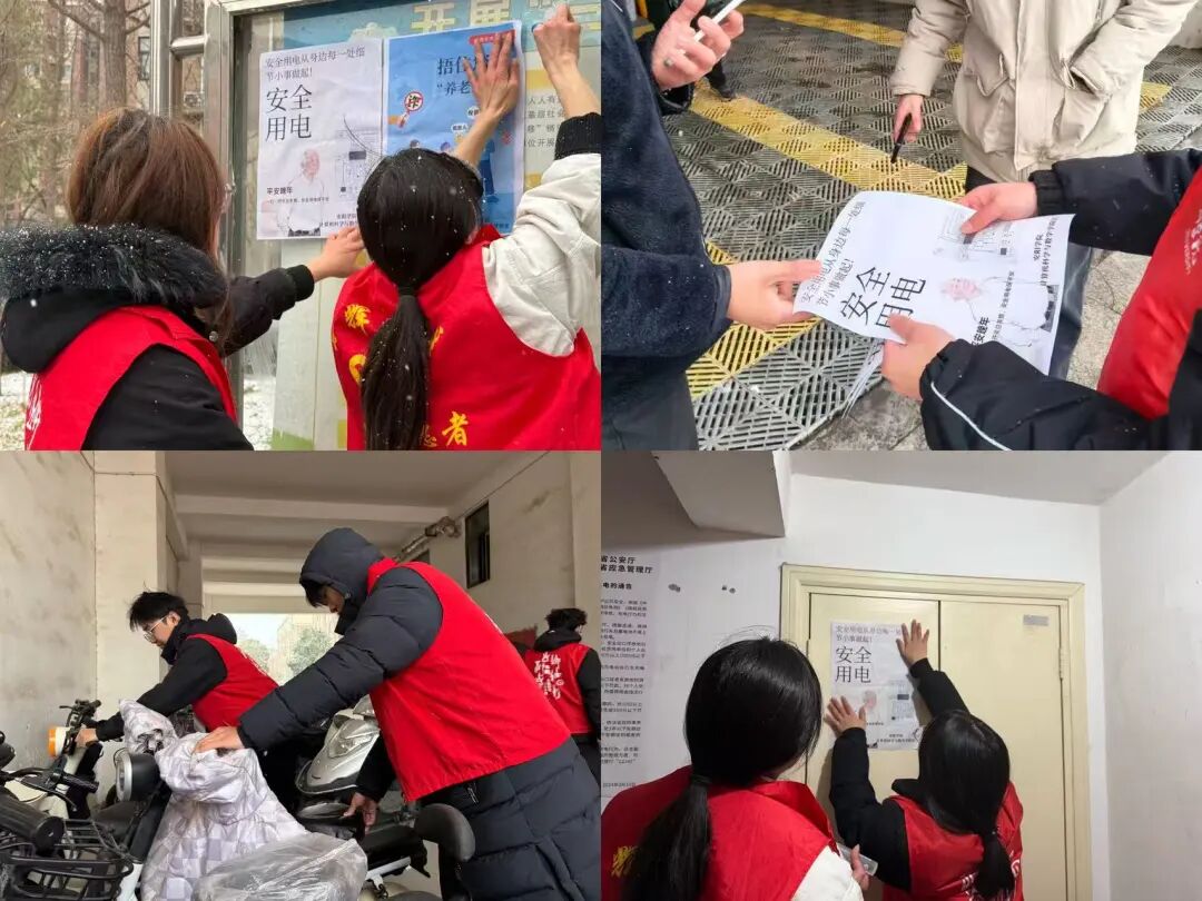 会议结束后,志愿者们迅速分组行动,投身于各项志愿服务工作。雪后的社区路面湿滑,电动车乱停乱放不仅影响通行,还存在安全隐患。志愿者们不畏严寒,分工协作,有序将散落在社区各处的电动车规整到指定停车区域,摆放得整齐划一,有效改善了社区的出行环境。同时,另一组志愿者手持用电安全宣传海报,在社区公告栏、单元门口等醒目位置仔细张贴,确保居民能清晰看到。此外,志愿者们还主动走进居民家中,用通俗易懂的语言向老人、儿童讲解冬季用电注意事项,提醒大家规范使用电器、及时排查安全隐患,切实增强了社区居民的用电安全意识。