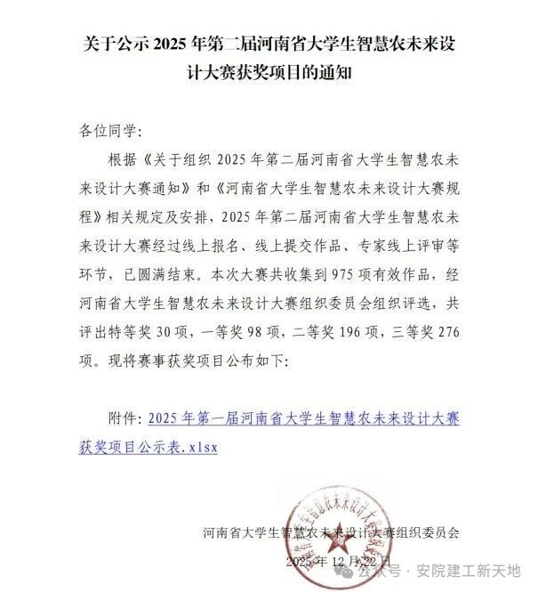 近日,第二届河南省大学生智慧农未来大赛落幕,我院学子团队喜获一等奖。